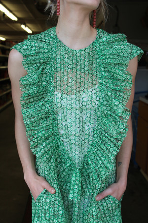 Lace smock dress with ruffle front. Back zipper, cap sleeves, side pockets, loose fit. Model is 5 7" and wearing size 4. Made in NY.