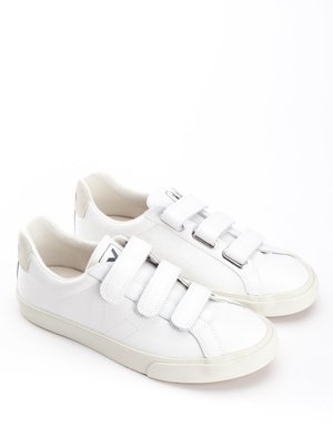The Veja Esplar 3 Locks Leather Sneaker in Extra White. - Upper in low-chrome leather - Lining in organic cotton - Inner sole in organic cotton & expensed rubber - Sole made of wild rubber from the Amazonian forest - Made in Brazil