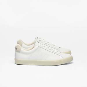 The Esplar Leather Sneaker by VEJA features a clean, minimal design in extra white. Weight: 1.2 Upper: Leather Panels: Suede Insole: Amazonian rubber (11%), E.V.A. bio-sourced (45%, including 36% sugar cane), recycled E.V.A. (13%), organic cotton (5%) and others (26%) Outsole: Amazonian rubber (50%), mineral silica (26%), synthetic rubber (5%) and others (19%) Lining: 100% recycled polyester Laces: 100% organic cotton Made in Brazil. The bovine leather comes from farms in Uruguay, a country known for its culture of animal husbandry and the quality of its leather. It is tanned in Brazil, respecting REACH norms, with special attention paid to water usage during the tanning process.