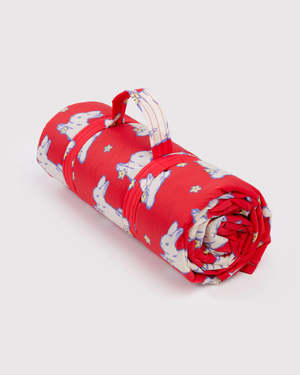 A quilted ripstop picnic blanket with a carrying strap so you can roll it up and bring it anywhere. - Recycled nylon top, recycled polyester bottom - Measures 72" x 54" - Machine washable