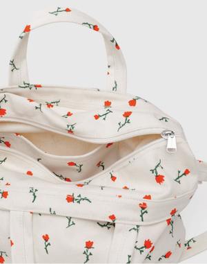 A reimagined version of BAGGU's classic Duck Bag, flipped on its side and sized down a bit to create a bag that's easy to wear and even more accessible. Its perfect for toting your laptop, yoga clothes, or crafting supplies. Print: Painted Wildflower Fits a 15" MacBook Interior zip pocket, durable taped seams Adjustable strap with top carry handles, 16 " max strap drop Measures 12 " 17" 4 " 16 oz recycled cotton canvas Machine washable.