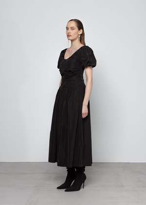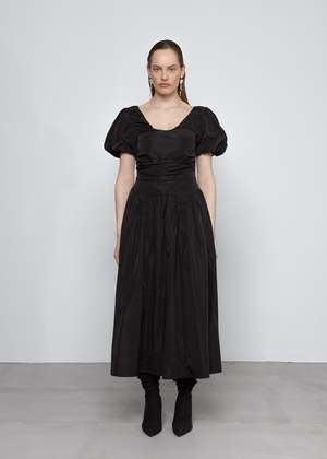 Crafted from lightweight, crisp semi-sheer taffeta, this relaxed-fit dress features a straight neckline with frill and adjustable self-fabric straps. Designed with side seam gatherings and a back button closure, its unlined and works perfectly as a layering piece.