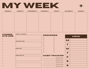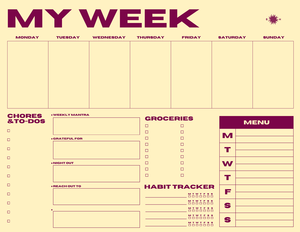 Our best-selling Our Week planner is now available in mini form. The Mini My Week planner is the ideal size for desks, fridges, and nightstands. Designed to help you maintain balance in your life as well as be reminded of everything you have on your plate. Also cute enough that you want to keep it out on your counter for guests to see. 11" x 8.5"