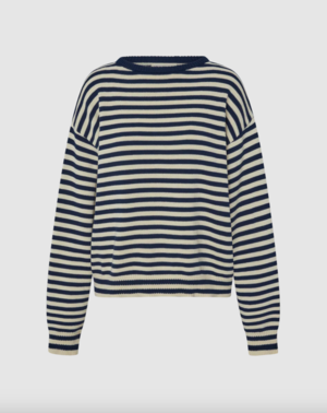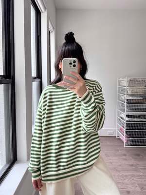 At Snderhaus, they take pride in creating timeless pieces that resonate across generations. From the beginning, prioritizing sustainability and ethical practices has been a driving force for the founders. The brand only uses factories that embody their same values of sustainability and ethics. They craft their garments using natural fibers that can be recycled or composted after years of love and repair. When necessary to the construction or nature of the garment, the brand uses recycled polyester to help reduce the waste created by the fashion industry. Based in Utah. This top will 100% be mistaken for a vintage sweater, in the perfect stolen-from-the-back-of-your-dad's-closet fit. - Navy stripe color - 100% Organic cotton - True to size for an oversized fit, size down if in between - Loose fit - Boxy cut Measurements: - XS: 43.5" waist, 43.5" bust, 22" length, 22.5" sleeve length - S: 45" waist, 45" bust, 23" length, 23" sleeve length - M: 46.5" waist, 46.5" bust, 24" length, 23.5" sleeve length - L: 48" waist, 48" bust, 25" length, 24.5" sleeve length Christina is 55 wearing size M. SKU: SOA6151 Please note, measurements are provided to serve as a guide. We are not able to guarantee each garment's measurements as there are slight deviations due to the handmade nature of our designers' garments.