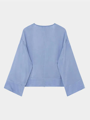 The Davies Silky Touch Blouse by Day Birger et Mikkelsen brings refined sophistication to any wardrobe. It is crafted using cupro, which is made from recycled cotton waste and nicknamed "vegan silk" for its luxurious silk-like drape, as well as being breathable, moisture-absorbent, hypoallergenic, and durable. Designed with dropped sleeves, a wide hem and cuffs, and centre front and back seam top-stitching detail, there is a front neck opening with button fastening allowing the piece to be worn closed as a round neck or open as a V-neck. An ideal piece for both work and evening wear, this blouse pairs effortlessly with tailored trousers, denim, and skirts alike. Details - Blue blouse - Crafted from a silky viscose/cupro blend - Wide long sleeves - Wide hem and cuffs - Opening at front with subtle button closure - Decorative top stitch at centre back seam Fabric & Care Composition: 56% Cupro, 44% Viscose. Care: Gentle machine wash at 30C. Do not bleach. Do not tumble dry. Iron on low heat. Do not dry clean.