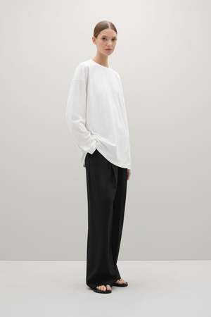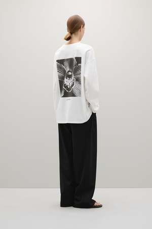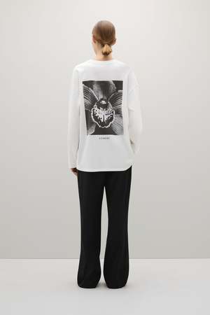 The Orchid Long Sleeve T-Shirt is an oversized, long sleeve T-shirt with a relaxed fit, featuring a black and white A.EMERY orchid graphic on the back. Color: Parchment Fabrication: 100% Cotton Fit Notes: This top runs big
