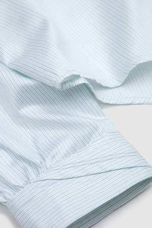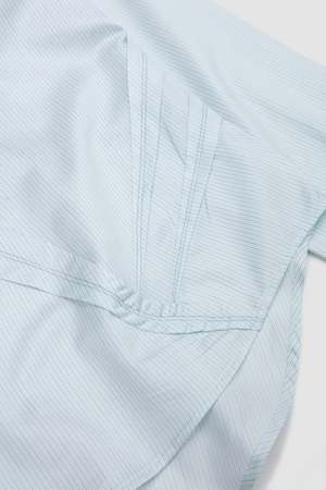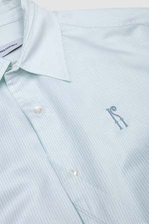 The Ohne K-Dart Shirt is a regular fit shirt with a point collar. It features signature K-Dart construction through the front and back, shaping a distinctive silhouette. Finished with a classic button-up front, buttoned cuffs, and mother-of-pearl buttons. Detailed with contrast chest embroidery. Crafted from double striped cotton shirting. Also available in crinkled printed cotton.