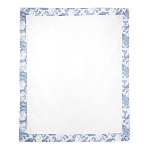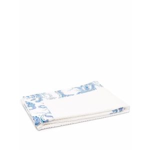 White cotton beach towel with a flocked finish, paisley print, contrasting border, and rectangular shape.