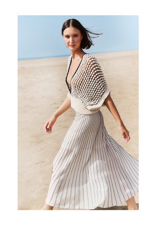 Textured knit vest with openwork details in off-white, contrasted with black. Features a button closure at the waist. Composition: 70% Cotton, 30% Polyamide.