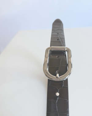 The Mija belt in embossed croco leather balances everyday ease and refined elegance with its sculpted silhouette, silver-tone buckle, and Italian craftsmanship. Handcrafted in Italy with genuine suede lining. 1" width.