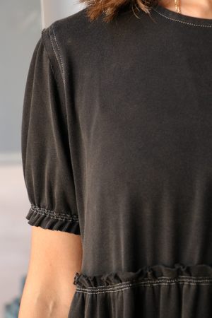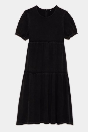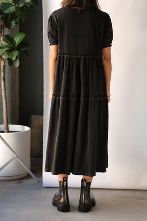 R13 Shredded Relaxed Midi Dress in black. Midi length tiered silhouette with gathering at seams and a raw hem. This dress has acid and stone wash for worn-in look and hand feel. - Color: Black - 100% Cotton - Machine wash cold, Do not tumble dry - Imported - Model is 5'4 wearing size XS | Model wears a size 0 (XS) in tops and size 24 (0) in bottoms. - Paired with R13 Single Stack Chelsea Boots.