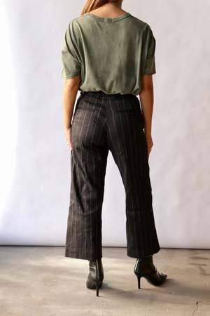 These versatile trousers showcase a distinctive front leg zip that lets you customize your look with ease. The classic black and silver wide pinstripe pattern delivers timeless sophistication, while the innovative design detail offers creative styling possibilities for any occasion. Made in Italy. Color: Black silver pinstripe. 78% linen, 17% polyamide, 5% elastane.