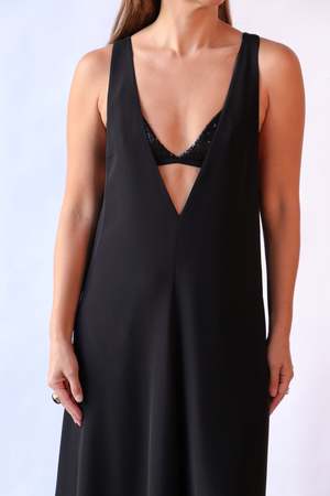 The 4-Ply Silk V-Neck Dress is crafted sustainably with attention to detail. It features a deep V neckline at the front, back, and sides to highlight a sequin bralette, tank, or any layer you choose. An adjustable detachable strap at the back ensures a secure fit, while convenient side pockets add functionality. - 100% Silk - Color: Black