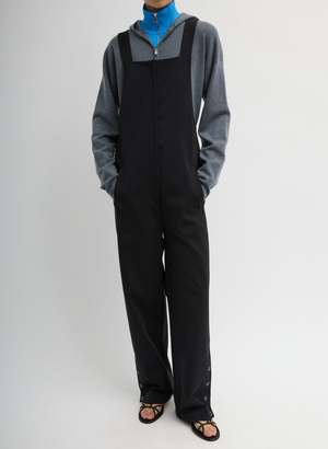 The Compact Tech Knit Overall from Tibi in black is crafted from a Japanese wrinkle-resistant tech fabric. The front zipper closure offers easy wearability. - Customizable fit with adjustable straps and a belted back - Lightweight knit with subtle piqu texture - Features snaps at the hem to create multiple slit options - Style it solo for a streamlined look or layered over Double Faced Cashmere pieces - Perfect from day to night 100% Polyester. Imported.