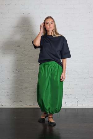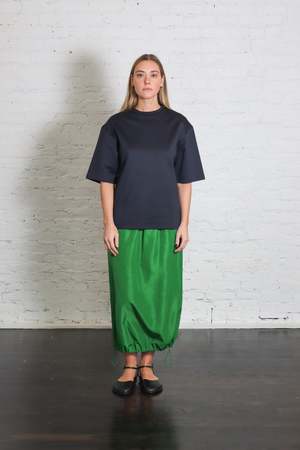 A signature Tibi fabrication in a fresh, modern silhouette. Crafted in a lightweight yet structured fabrication that softens the volume, this otherwise bold long style is intentionally grounded. The skirt features an elastic waistband and an adjustable cord at the hem that can be cinched or released to create multiple shapes and lengths on the go. Details - Type: Skirt - Fabric: 100% Polyester - Color: Green - Style ID: #R125TT5381 - Collection: PS26