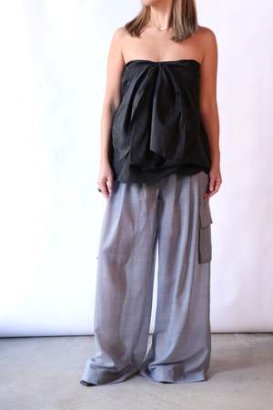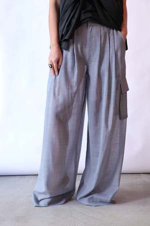 Tibi's iconic Triple Pleat Pant is reimagined in airy wool gauze, offering lightweight sophistication with structure. The sheer fabric provides texture and movement, while belt loops and cargo pockets add practicality. Its natural drape makes it ideal for layering under shirts or oversized knits for a modern silhouette. - 89% Wool 11% Polyamide Color: Heather Grey
