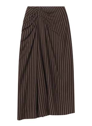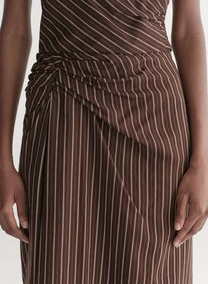 The Jean Skirt is crafted from barre-stripe shirting in a ganache-brown palette with soft drape and fluid movement. The midi column silhouette is defined by asymmetrical gathering at the hip, creating directional lines that fall into a subtly uneven hem for an easy, sculpted effect. - Midi column silhouette with asymmetric hip gathering - Barre-stripe shirting with a soft, fluid drape - Subtly uneven hem for natural movement - Clean waistband that sits at the natural waist