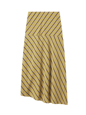 The Kara Skirt by A.L.C. is crafted from barre stripe shirting in a curry and ganache-brown palette. This pull-on style features a high-rise waist and a fluid midi-length silhouette. Product Details Designer ID: 3SKRT00751 Color: Curry/Ganache Composition: 89% Viscose, 11% Polyamide.