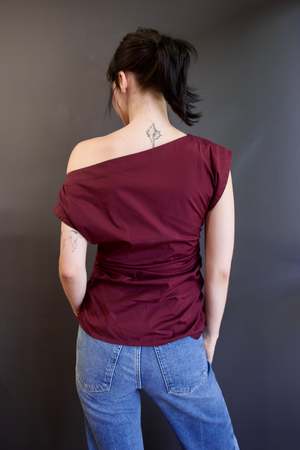 The Nara Top is crafted from black Pima stretch poplina soft, breathable fabric made from long-staple cotton fibers with a smooth finish, fine texture, and gentle structurewith a hint of stretch for ease. This off-the-shoulder silhouette features sculptural draping across the neckline, with gathered side seams that cinch at the waist and release into a smooth, hip-length hem.