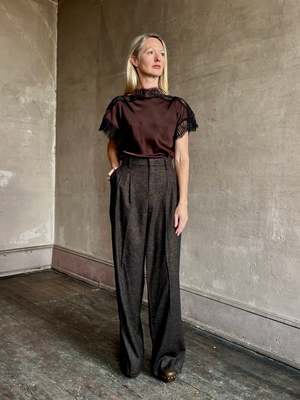 The Luna Top by A.L.C. features a contemporary boat neck silhouette with refined lace trim accents. Crafted from premium 100% viscose with 100% polyester lace trim, this blouse offers a sophisticated two-tone cocoa black colorway. The short sleeve design and flattering neckline provide versatility for both professional and casual occasions. Made in China. Professional dry cleaning recommended.