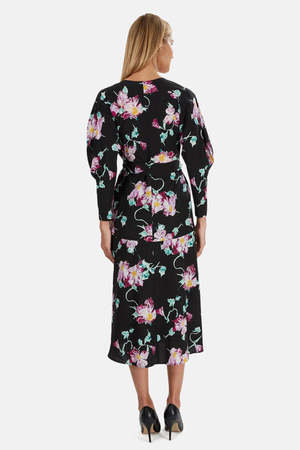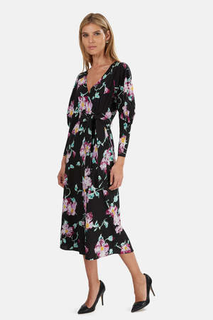 - Color: Black/Purple - Stretch silk crepe fabric - Painted floral print - Midi length - Wrap silhouette - Voluminous sleeves with elongated cuffs - Belted waist - Partially lined - 92% Silk 8% Elastane - Imported - Dry clean only * Model is 5'9" wearing size 4 Designer A.L.C.