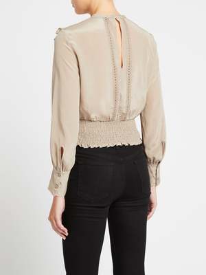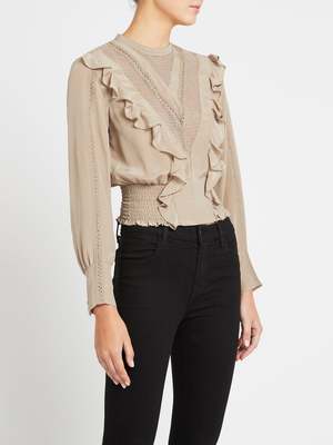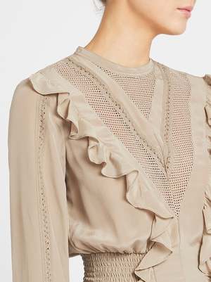 The Suite Blouse by IRO comes here in Khaki. Soft and feminine, this long sleeve blouse features a round neckline with front panelled net lace detailing with stunning flounce accents and is finished with elasticated ruched cuffs. Pairs perfectly with a tailored trouser or team back with denim for an effortless chic look. ----FABRIC OR COMPOSITION The IRO Suite Blouse in Khaki is made from 100% Silk with 100% Cotton lace SIZE AND FIT The IRO Suite Blouse in Khaki fits true to size Neck Drop: 7cm / 2.7inch Sleeve Length: 59.5cm / 23.4inch Back Length: 48.5cm / 19inch Measurements taken from a size 36 FR Model is wearing a Size 36 FR, Sarah is 178cm / 59 Bust 83cm / 32 1/4 in /// Waist 66cm / 26 in /// Hips 89.5cm / 25 in24cm 94cm BRAND Since IRO Paris reached the shores of Australia, it has become a cult brand renowned for its unique street style. The brainchild of Parisian brothers Laurent and Arik Bitton, IRO is inspired by their passion for music and fashion. Best loved for their IRO leather jackets and IRO jeans, the brands style is epitomised by classic Parisian chic combined with rugged street style. Draped mini skirts, luxurious leather jackets and sexy skinny jeans, IRO is the womens clothing brand for those that want to make an impact with their style. Shop IRO clothing online at Order of Style today.