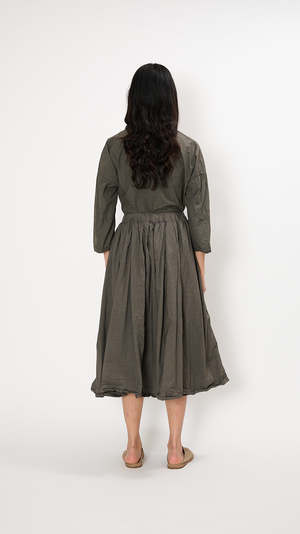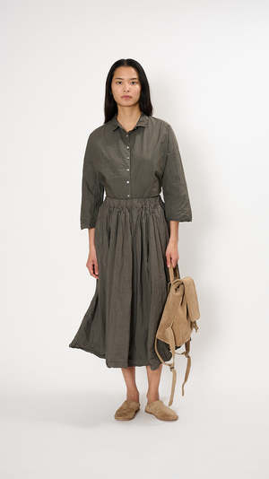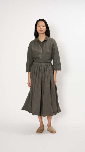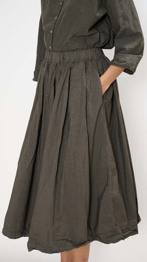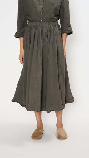 Album di Famiglia Pleated Long Skirt in Antracite The Pleated Long Skirt has a pleated, a-line silhouette made of a cotton blend with a crumpled texture. It features an elasticized waistband with an inner drawstring and side seam pockets. Material: 100% Cotton Machine wash gentle Made in Italy