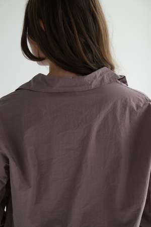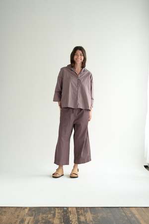 Album di Famiglia signature button-down shirt with a small pointed collar and 3/4 sleeves in lightweight cotton canvas. Features dropped shoulders and a rounded shirt hem. Finished with mother-of-pearl buttons. 100% cotton. Made in Italy. Caroline is 5'5" wearing size XS. Also available in pebble, mauve and white.