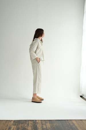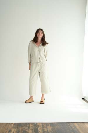 Album di Famiglia signature button-down shirt with a small pointed collar and 3/4 sleeves in a lightweight cotton canvas. Features dropped shoulders and a rounded shirt hem. Finished with mother-of-pearl buttons. 100% cotton. Made in Italy. Caroline is 5'5" wearing size XS. Also available in black, mauve and white.