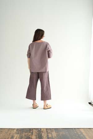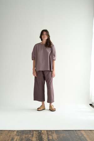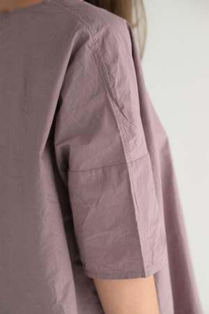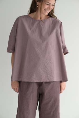 Album simple T-shirt in cotton poplin (TC fabric). Features a rounded neckline and short sleeves with a dropped shoulder. Size Small or Large only. 100% cotton. Made in Italy. Caroline is 5'5" wearing size small. Also available in white and black.