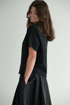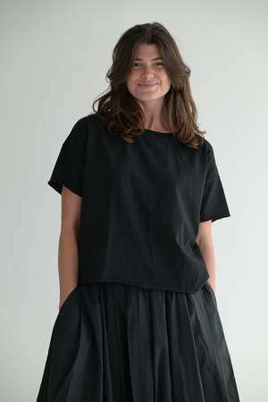 Album di Famiglia's T-Shirt HC is made from heavy cotton and features short sleeves, a rounded wider neck, dropped shoulders, and an unfinished hem. 100% Cotton. Made in Italy. Caroline is 5'5" wearing size XS.