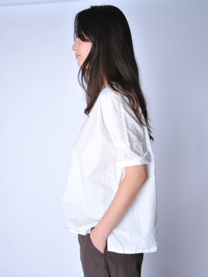The Simple T features an open neck, drop shoulder, and short sleeves. Album's classic top is in high demand year after year. Model is 5'8" and wearing size S. Made in Italy. 100% tissue cotton.