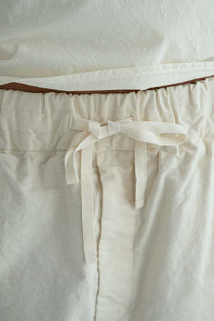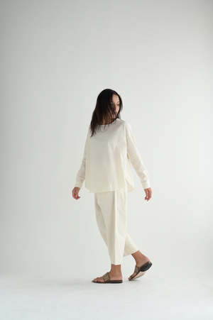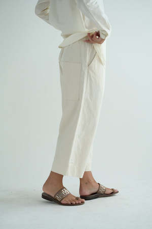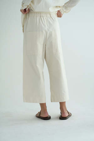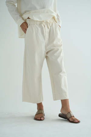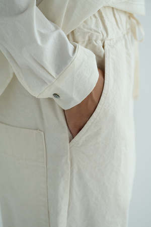 Album's Wide & Short Trousers offered in Japanese Raw Cotton canvas in natural. Signature style with wide leg, elastic waist with drawstring, front side seam pockets, back patch pockets. Made in Italy. Adeline is 5'7" wearing size XS.