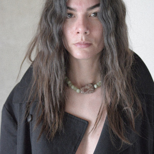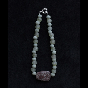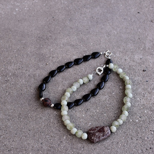 An emphasis on earth, weight, and surface. BARRO centers on a carved jasper form marked with natural pattern and sediment-like movement. The stone sits within a field of pale green beads, their matte surfaces softening the composition while allowing the central form to remain grounded and present. The irregular patterning of the jasper guides the piece rather than symmetry a quiet study in contrast between density and restraint. Designed to sit close at the collarbone, creating a compact sculptural line at the neck. One available. Finished with a sterling silver clasp. Arrives in a Studio Solz organic cotton drawstring bag.