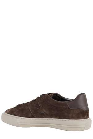 Sneakers by Hogan. H691 lace-up model in brown suede leather. Features a round toe, leather upper, embossed lateral H, tone-on-tone stitching, reinforced blue leather heel, memory foam insole, rubber sole, and cotton laces.