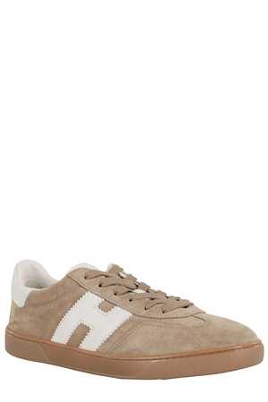 Sneakers by Hogan. Model H327 Allacciato H in beige and white. Features a round toe, contrasting white leather side H, logo2ed tongue, leather upper, reinforced white leather heel, cotton laces, memory foam insole, and yellow rubber sole.