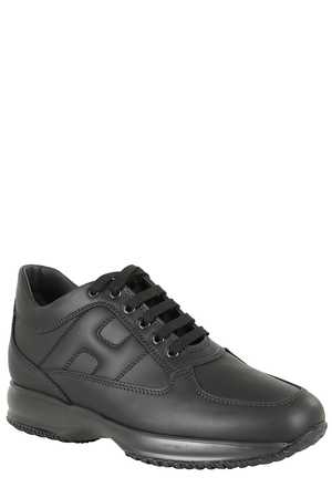 Sneakers by Hogan. Interactive model in black with a round toe, leather upper, side logo2, tone-on-tone stitching, cotton laces, and a rubber interactive sole.