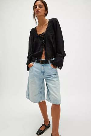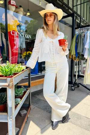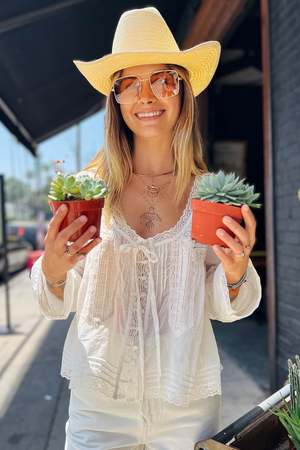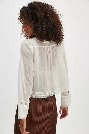 A relaxed fit, slightly cropped long-sleeve top crafted from soft cotton. Features a square neckline with tie detail, button closures, long sleeves with cuffs, and sheer lace trim. Pairs well with slouchy jeans or a mini skirt. Materials: 100% Cotton Measurements for size Small: - Bust: 39 in - Length: 21.25 in - Sleeve Length: 26.25 in