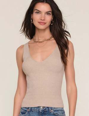 The Indra Top by HEARTLOOM is perfect for a trendy and festive look. Crafted from a soft, sparkly knit, it features a V-neckline and a fitted silhouette. Wear it for both chic and casual occasions. Details: - Fitted cut - Rounded V-neckline - Decorative ribbed stitching - Length (measured on size S): 30" / 76 cm (from shoulder) - Color: Beige - Model is 5'10" (Bust: 34", Waist: 24", Hips: 35") and wears size XS - 57% viscose, 16% polyester, 17% nylon, 10% metallic thread - Delicate cycle wash