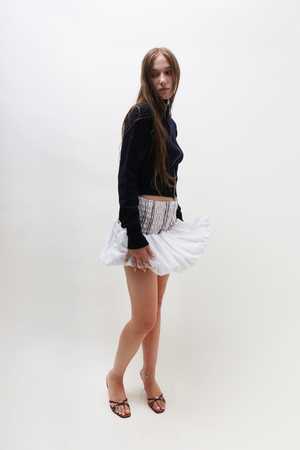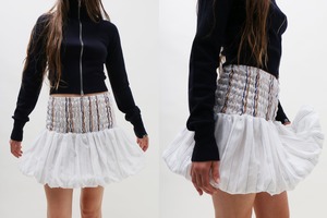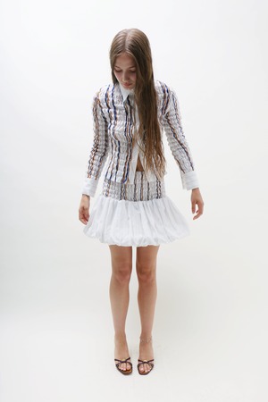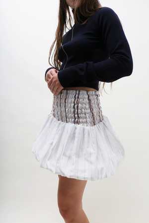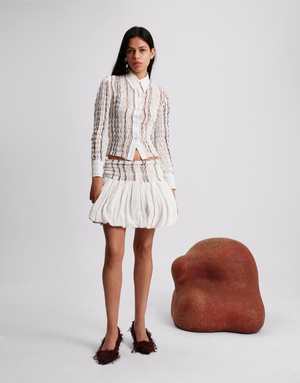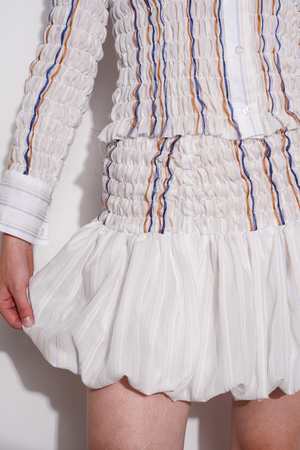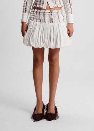 A Maimoun Exclusive, smocked mini skirt in lightweight striped cotton with woven yarns running softly throughout. A voluminous bubble hem adds sculptural shape, held in tension by the fabrics generous 70% stretch. Each size is designed to span two, adapting gently to the body. Tori is 5'9" tall and measures 33" bust, 24 waist, 34.5" hips and wears size S. Fabrication is: 100% Cotton, Threads Embroidery: 100% Polyester. Hand wash only.