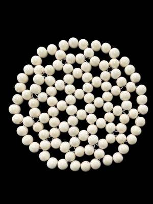 The Larco Large Single Coaster is a large round coaster made from cream glossy wooden beads and white elastic cord. It is heat resistant and handmade in the Netherlands, with a high-shine surface that reflects light softly. The generous size makes it suitable for a teapot, pan, or serving dish. - Painted wood with elastic cord - Diameter: 18 cm - Bead size: 20 mm - Weight: 0.3 kg - Made in the Netherlands