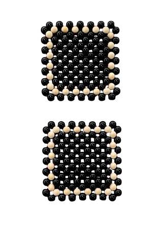 The Reverse Tile Coaster Set by Pien Studios includes two small coasters with a tile-inspired pattern. They are made from natural and painted wooden beads strung on a red elastic cord. The coasters are heat resistant and suitable for cups or small bowls. Materials: Natural and painted wood with elastic cord. Dimensions: 11 x 11 cm Bead size: 15 mm Weight: 0.15 kg (set of two) Made in the Netherlands.