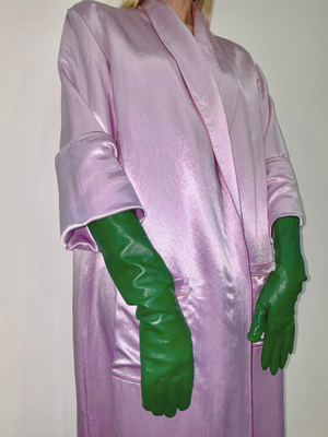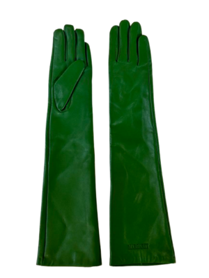 Fine leather opera gloves in Bottle Green. Fully lined, elbow length. Debossed micro logo2 at each gloves hem. 100% Sheepskin. Size measurements reference the circumference of your palm: Small 7 in., Medium 7.5 in.