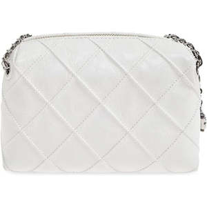 The Fleming Distressed Leather Crossbody Bag by Tory Burch is crafted from 100% nappa leather. Origin: Imported Closure type: Magnetic - Height: 4.5" (11.5 cm) - Length: 7.1" (18 cm) - Depth: 2.4" (6 cm) - Metal chain and leather shoulder strap: 22.2" (56.5 cm) - Top zipper closure - Silver hardware - Hanging T logo2 charm - Single internal zippered wall pocket
