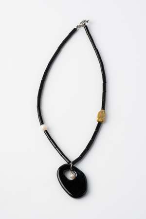 Inspired by the deep darkness of the ocean, Eye of the Ocean is a pendant necklace that embodies strength, stillness, and inner balance. The black onyx beads are carefully chosen for their grounding energy, offering protection and emotional stabilitylike the silent depths of the sea. At its center, a hand-crafted rock-shaped pendant made from recycled glass reflects subtle light, evoking the oceans hidden eye. Freshwater pearls and a green baroque pearl add a soft, organic contrast, symbolizing life and renewal emerging from the deep. Each piece is handmade and unique. Handcrafted by local artisans from Peruvian turquoise natural beads and recycled glass. Waterproof and hypoallergenic: resistant to water and perfume, suitable for everyday wear, even on the hottest days. Consciously created: each piece is produced on demand to reduce water and energy consumption. Product info: - Weight: 55 g - Dimensions: 55 cm - Materials: Natural onyx beads, recycled glass, freshwater pearl, green baroque pearl, stainless steel - Colour: Black, pearl, green Made in Barcelona, Spain.