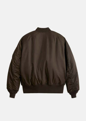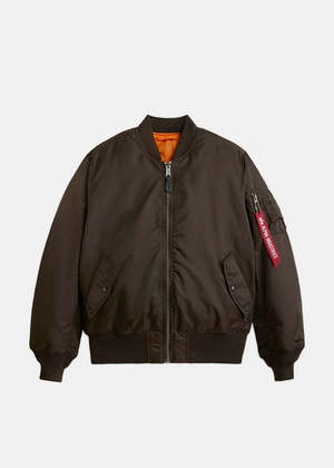 Classic MA-1 bomber jacket with ribbed trims and zip fastening. Features a sleeve pocket and side flap pockets. 100% Nylon. Made in China.