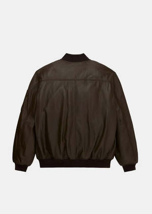 MA-1 leather jacket in brown with ribbed hem, zip fastening, sleeve pocket, round neck, and long sleeves. 100% Leather Made in China.