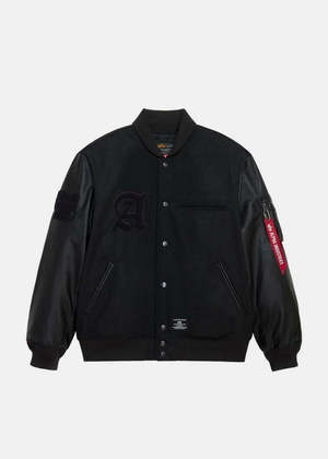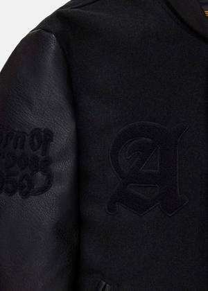 Pocket jacket in black with patch detail, press-stud fastening, long sleeves, and ribbed trims. 50% Wool, 50% Polyester. Made in China.