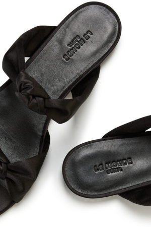 The stunning designs of Le Monde Bryl are reminiscent of the vibrant jewels that serve as the brand's inspiration. These sandals are fashioned from glossy black satin and feature knotted straps that creatively frame your feet, crafted by Italian artisans. Wear them to activities throughout the day or at night. Details & Care - 100% satin and leather - Bow detail - Flat sandal - Color: Black - Made in Italy Size & Fit - Fits true to size