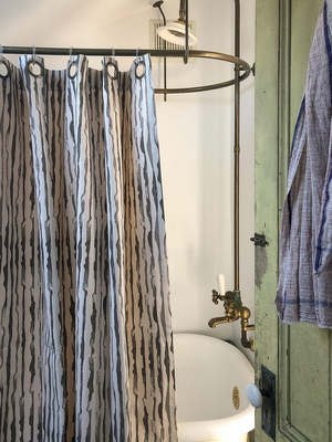 Cotton canvas shower curtain in the Erica Tanov original 'Alder' print. Features seven brass grommets at top. Measures 72" x 72". Erica Tanov Details Made in India. 100% Cotton. Hand wash separately in cold water. Line dry.